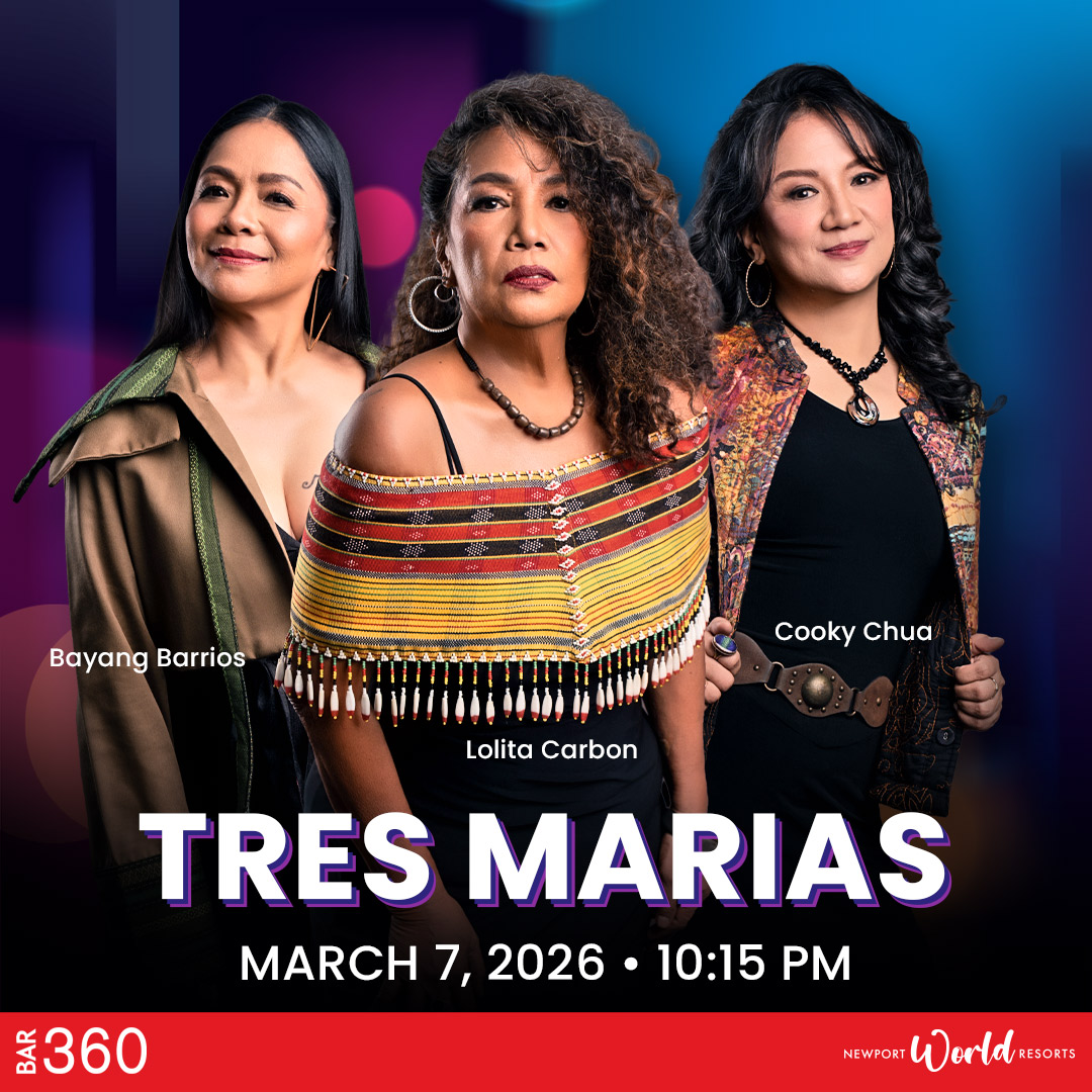 Also taking the stage this Women’s Month is Tres Marias, one of the most celebrated all-female trios in Original Pilipino Music. Composed of folk-rock icon Lolita Carbon of the legendary group Asin, world-music artist and folk musician Bayang Barrios, and indie rock singer-songwriter Cooky Chua of Color It Red, TRES Marias brings together three of the most distinctive and influential female voices in Philippine music history. Catch the trio perform at Bar 360, GF Garden Wing of Newport World Resorts on March 7, 2026 at 10:15 PM.